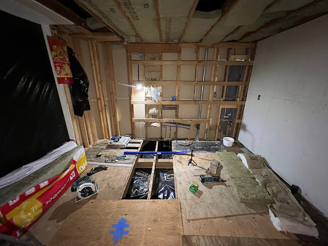 It was smack dab between high high tide (8:25 AM 12.6 feet) and high low tide (2:29 PM 6.8 feet), a good time to get in at the park. The wetsuit fit and kept me warm but my bare hands ached in the 46 degree F water. Floating on my back buoyed by the neoprene, I was able to keep my hands above the surface, like the otters I'm told frequent this inlet. Unlike them, I might invest in gloves.From sunbeams and sparkly water to the damp dirt of crawlspace beneath the bathroom to wrap pipes, emplace ground plastic, and insulate between floor joists. I prefer Rockwool batts because they're easy to install/de-install and don't degrade. They'll probably make irresistible nests so maybe later I'll screen them in with hardware cloth, but not today. Other than the plastic sheeting holding down ground moisture, I want to keep the crawlspace somewhat permeable and breathing.
